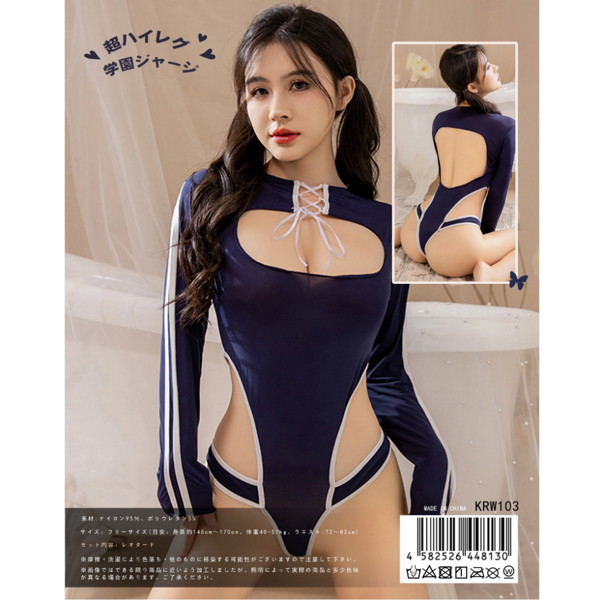 ☆ハイレグの限界に挑戦! 誘うVゾーンの学園コスチューム ☆バストの谷間もくびれラインも全部見せちゃうSEXYデザイン ☆動くほどカラダにフィットする全身一体型フェティッシュアイテム! 学園コスの定番中の定番・紺の生地と白ストライプをベースにしつつ、ボディコンハイレグを思わせる食い込みスク水にジャージ要素を加えてできた激カワSEXYアイテムです! バストの谷間、ウエストのくびれ、きわきわVゾーン…